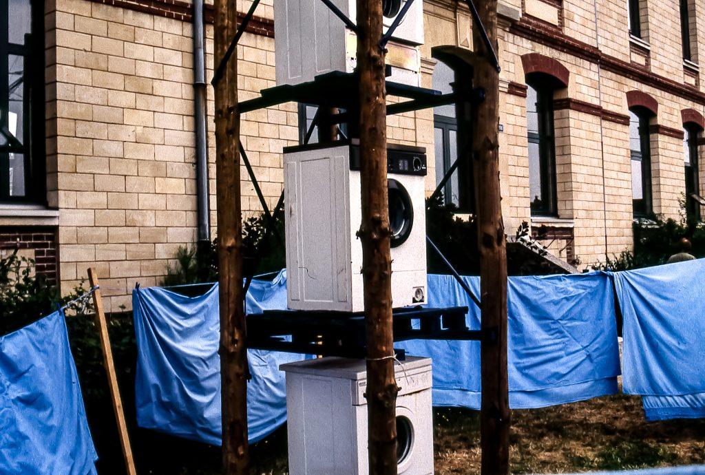 Blues / installation / performance Festival Viva Cité – Sotteville-lès-Rouen 1995 Laves linge et draps teints en bleu.